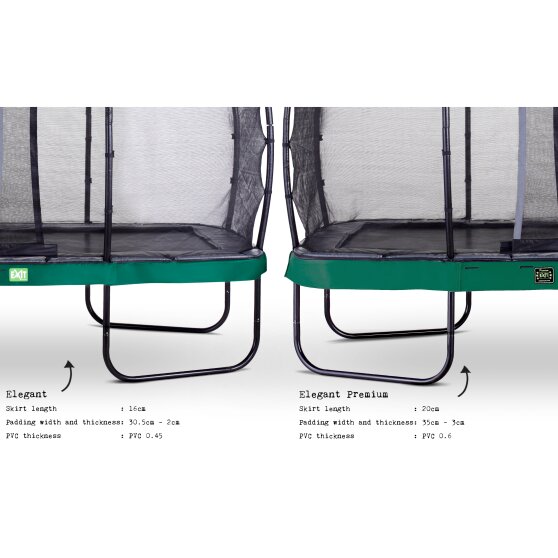 La EXIT Elegant Premium es una cama elástica rectangular de primera calidad con red de seguridad Deluxe, acolchada gris y faldón verde. El marco extremadamente sólido de esta serie de camas elásticas es fácil de montar. La cama elástica es seguro, hermoso y muy fácil de usar. La cama elástica Premium EXIT Elegant con red de seguridad Deluxe es un producto de primera clase: la joya de la serie Elegant. Pero ¿qué hace que esta cama elástica sea tan única?