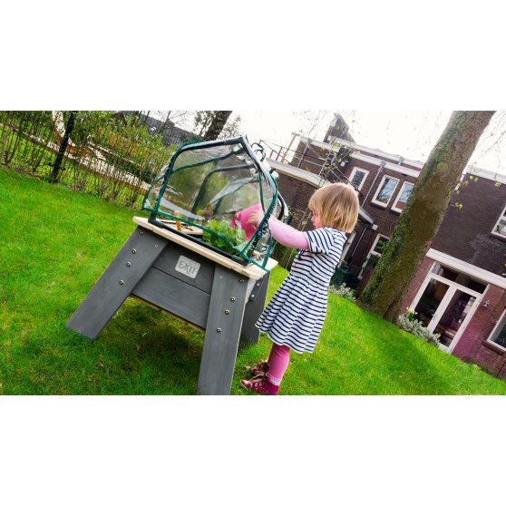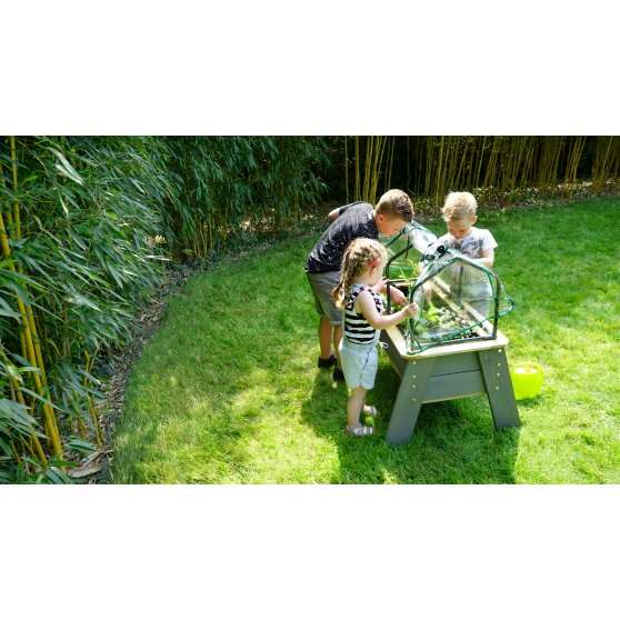 La mesa de cultivo EXIT Aksent L con invernadero y herramientas de jardinería es una forma educativa de enseñar a los niños sobre la naturaleza. ¿Arena, agua, flores y plantas? Estos son ingredientes ideales para enseñar a los niños cómo funciona la naturaleza. Elegid juntos las plantas que se pueden plantar en la arena. Con las mesas jardineras de EXIT Toys los niños podrán cuidar ellos mismos de sus plantas.
